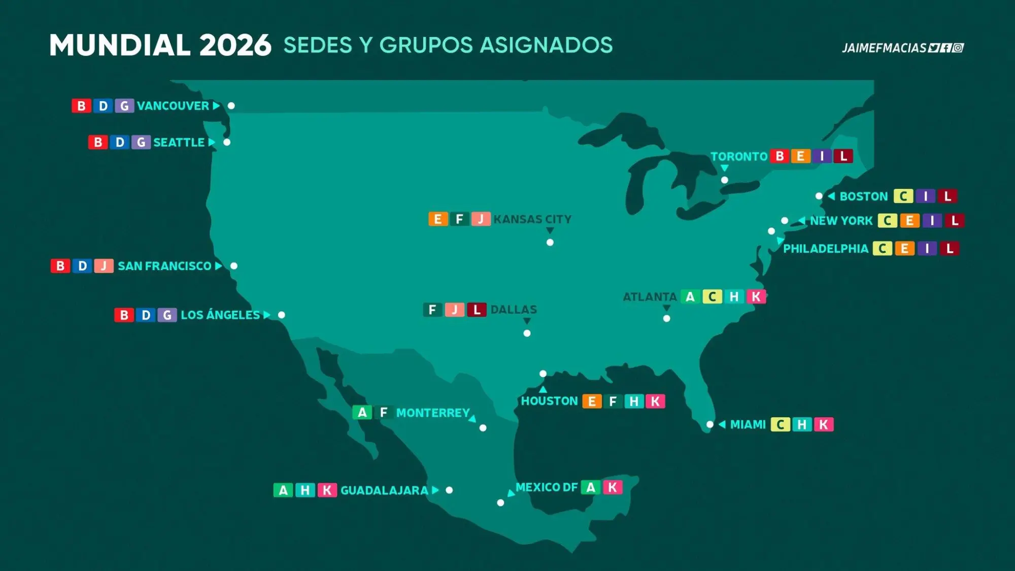 Los partidos del Grupo E se disputarán en las ciudades de Philadelphia, Toronto, Houston, Kansas City y Nueva Jersey, aunque la FIFA anunciará mañana el detalle oficial de estadios, fechas y horarios.