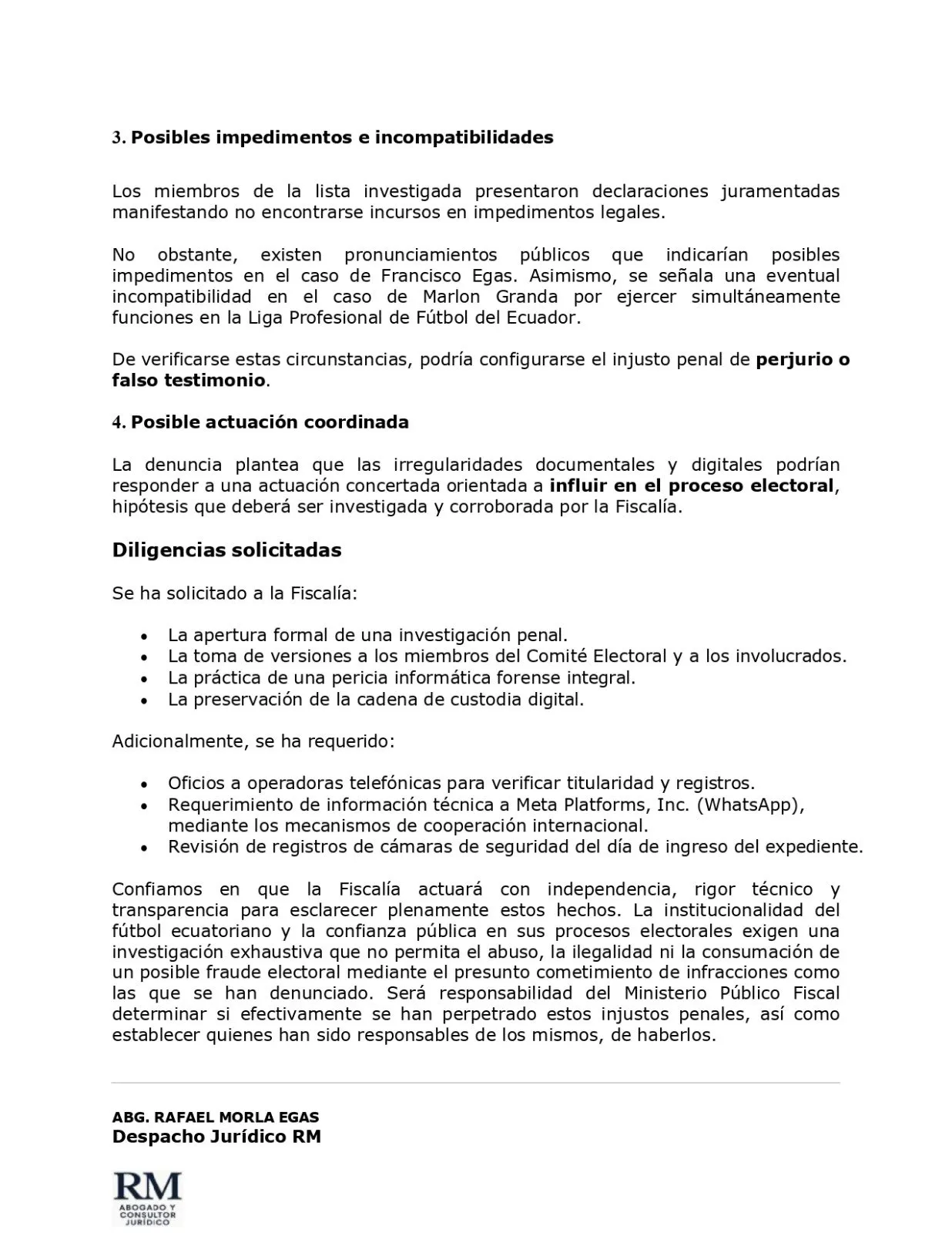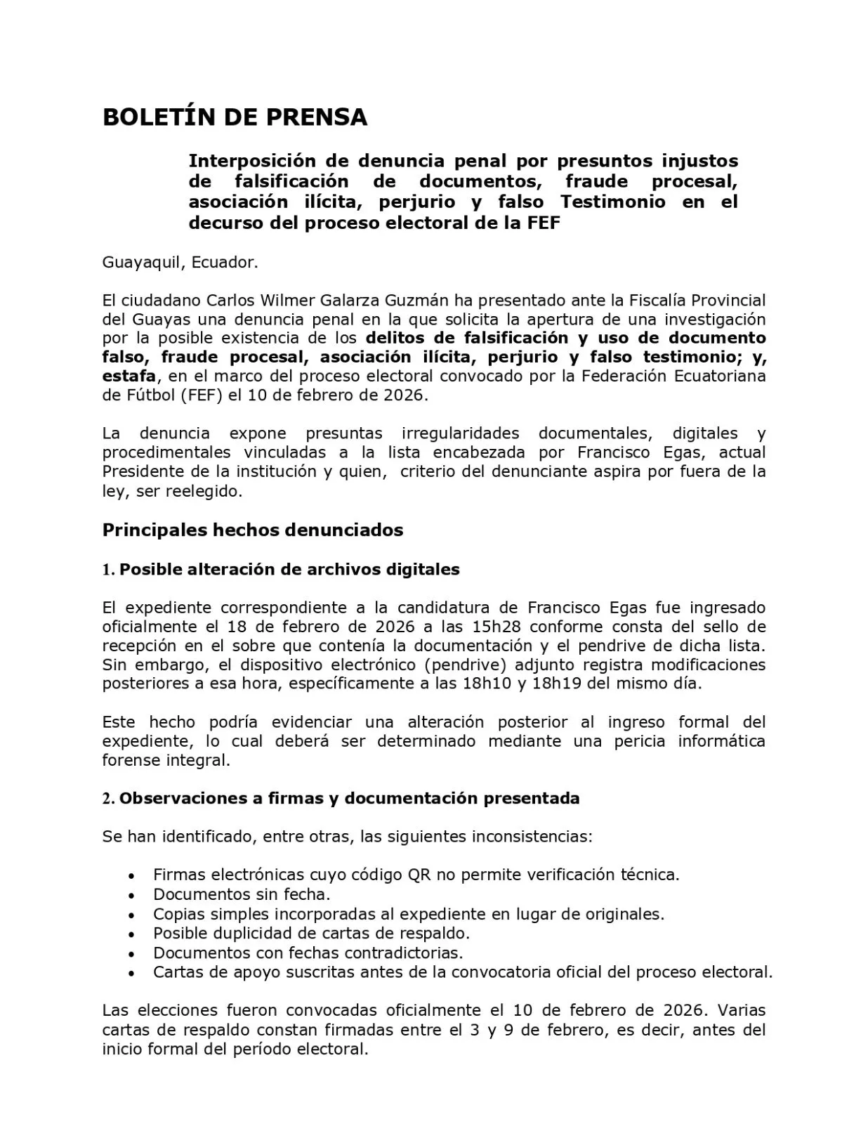 El exdirectivo solicita al ministerio publico la apertura de una investigación por la posible existencia de los delitos de falsificación y uso de documento falso, fraude procesal, asociación ilícita, perjurio y falso testimonio; y, estafa, en el marco del proceso electoral convocado por la Federación Ecuatoriana de Fútbol.