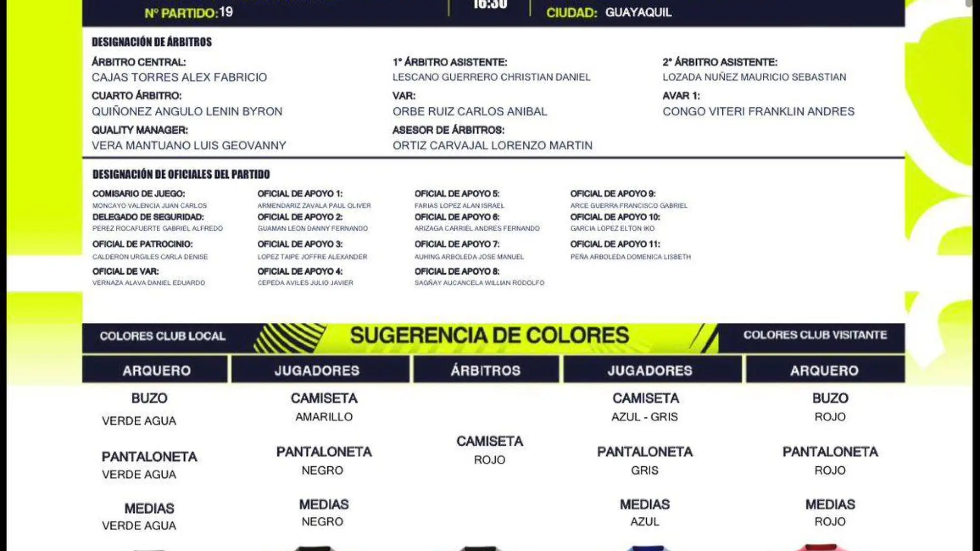 La nómina arbitral se completa con Christian Lescano como primer asistente y Mauricio Lozada como segundo asistente, mientras que Lenin Quiñónez cumplirá funciones de cuarto árbitro. En el sistema de videoarbitraje (VAR) estará Carlos Orbe, acompañado por Franklin Congo como AVAR 1.